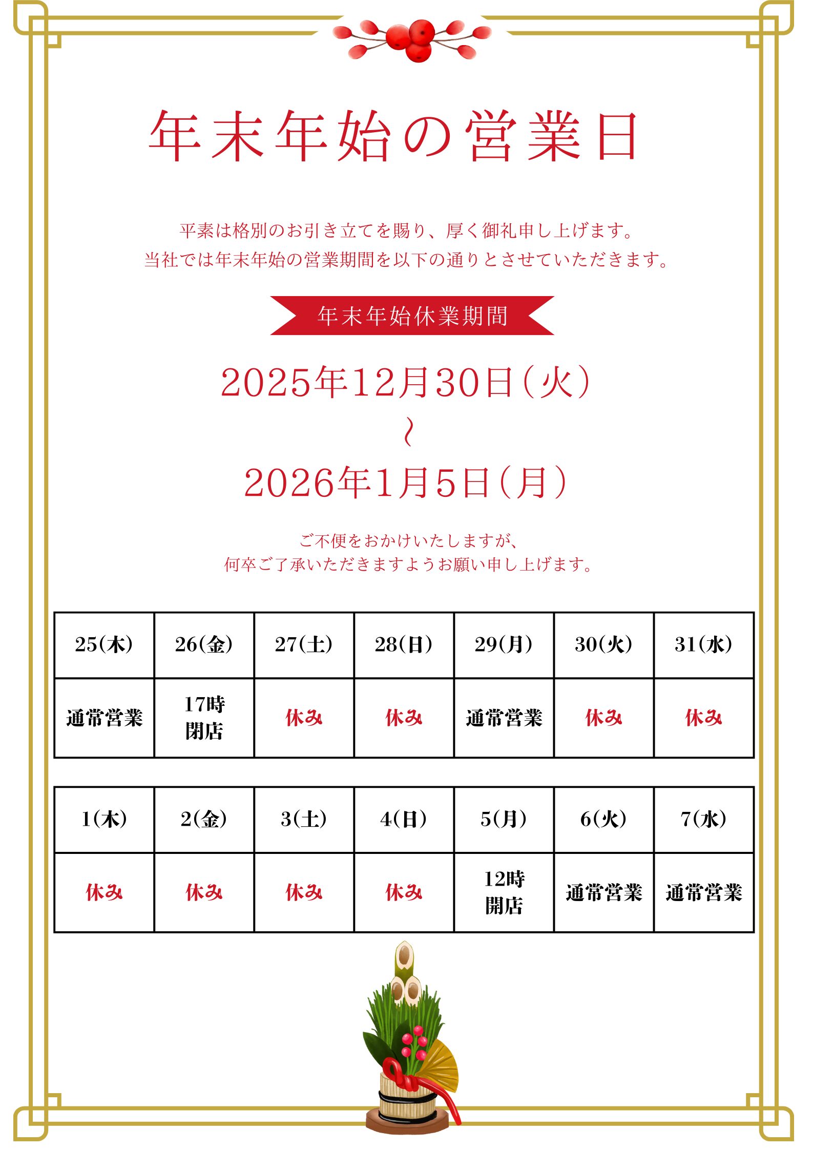 コンテンツ CONTENTS ホーム コンテンツ スタッフブログ 2026.01.05 新年のご挨拶 スタッフブログ 2025.12.29 年末最終営業終了のご挨拶 スタッフブログ 2026.01.01 初売りのご案内 スタッフブログ 2025.12.25 年末年始の営業日に関して back123next