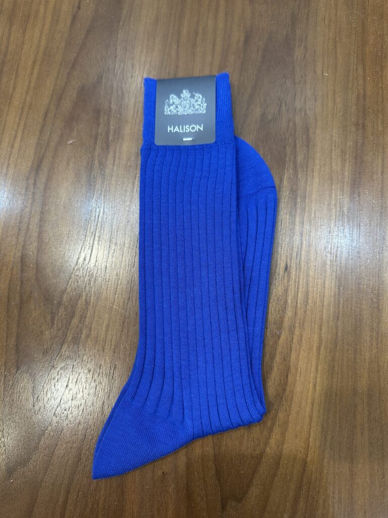 ブルーの靴下は、ネイビー系のスーツに軽やかさを加えてくれる色です。明るめの色で華やかさがあります。ほんの少し見えるソックスの色が、装いに気を配っている印象を与えます。